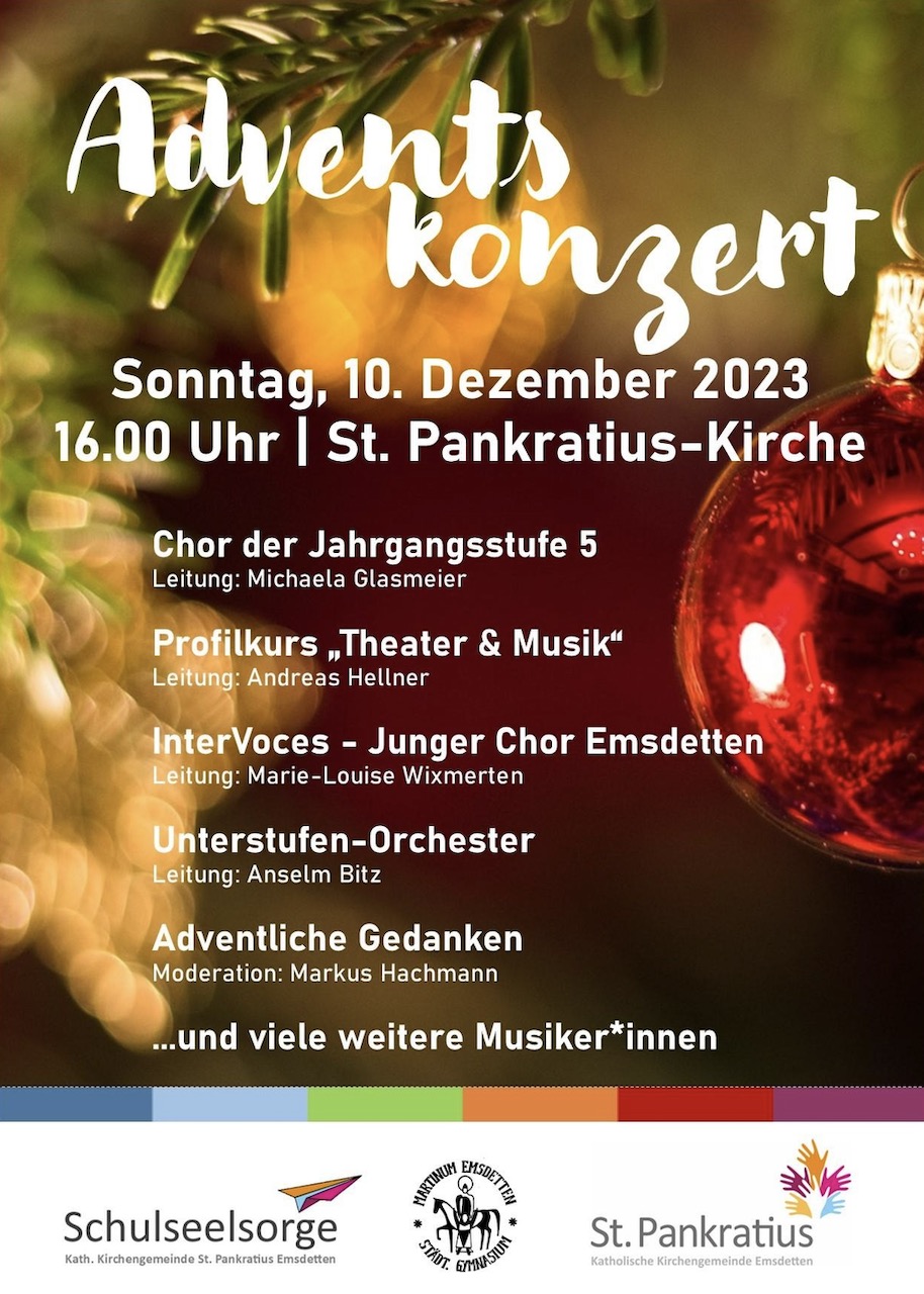 Am Sonntag, 10. Dezember fand das Adventskonzert in der St. PankratiusKLirche statt. Beteiligt waren der Chor der Jahrgangsstufe 5 unter der Leitung von Frau Glasmeier, der Profilkurs "Theater & Musik" unter der Leitung von Herrn Hellner und das Unterstufenorchester unter der Leitung von Herrn Bitz. Darüber hinaus waren Intervoces, der junger Chor Emsdetten, sowie viele weitere Musiker*innen am Konzert beteiligt.