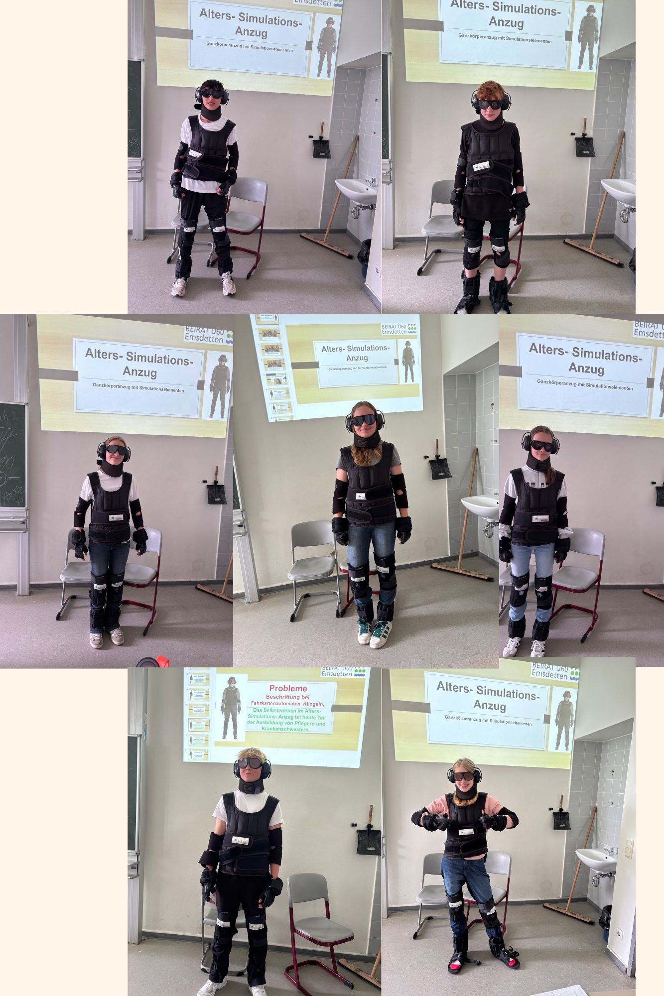Im Gepäck hatten sie einen sogenannten Alters-Simulationsanzug – ein Ganzkörperanzug, der mithilfe spezieller Simulationselemente verschiedene körperliche Einschränkungen des Alters erfahrbar macht. Gedämpftes Sehen, eingeschränkte Beweglichkeit, nachlassende Muskelkraft und ein reduziertes Hör- und Tastsinnempfinden konnten die Schüler:innen damit am eigenen Leib spüren. Normalerweise wird dieser Anzug in der Ausbildung sozialer und medizinischer Berufe eingesetzt.