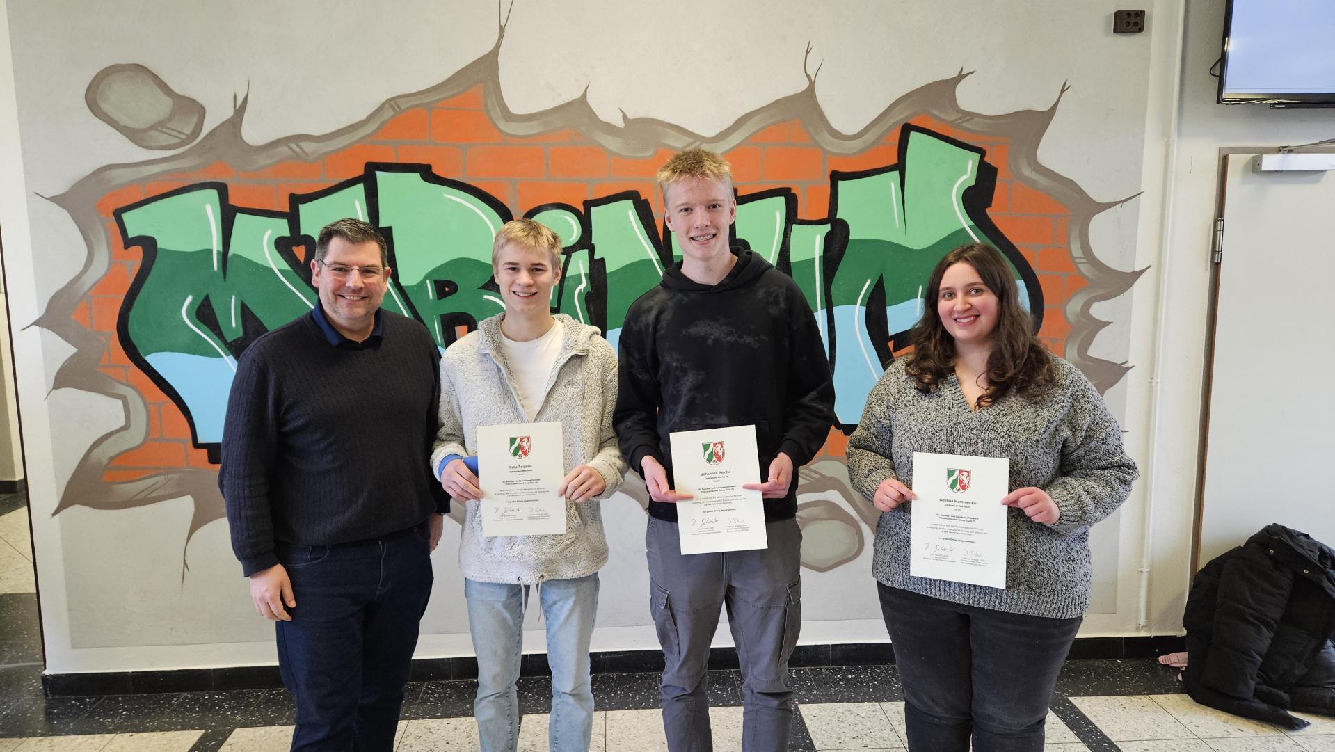 Eine Schülerin und zwei Schüler der Q2 (Jahrgangsstufe 12) des Martinums haben erfolgreich am diesjährigen Essay-Wettbewerb in Philosophie teilgenommen und wurden für ihre Leistungen mit Urkunden der Bezirksregierung und der zuständigen Dezernenten ausgezeichnet. Schulleiter Olaf Cimanowski gratulierte Adelina, Johannes und Felix am vergangenen Freitag herzlich zu ihrem Erfolg.