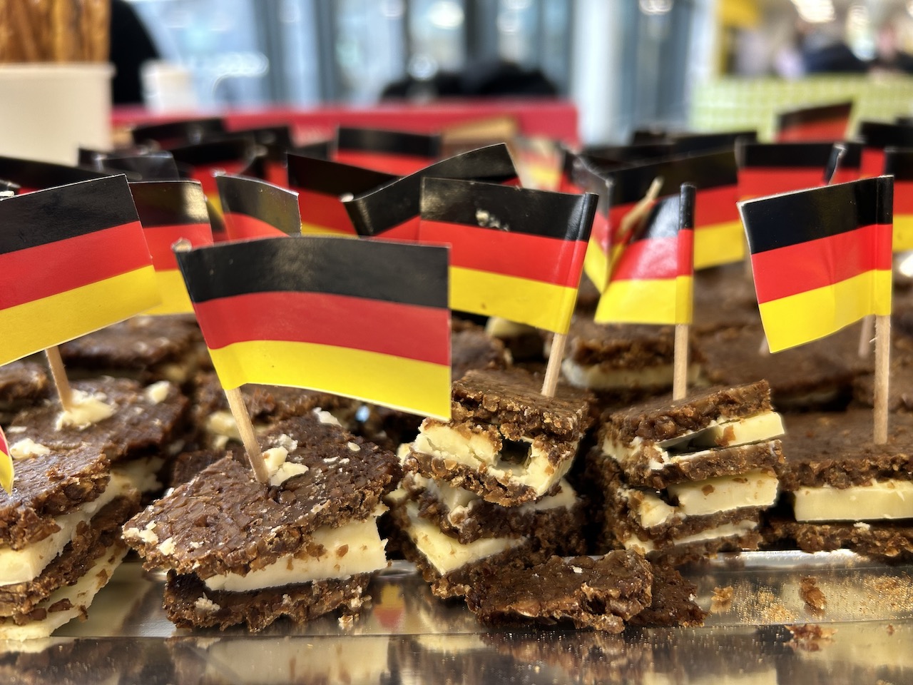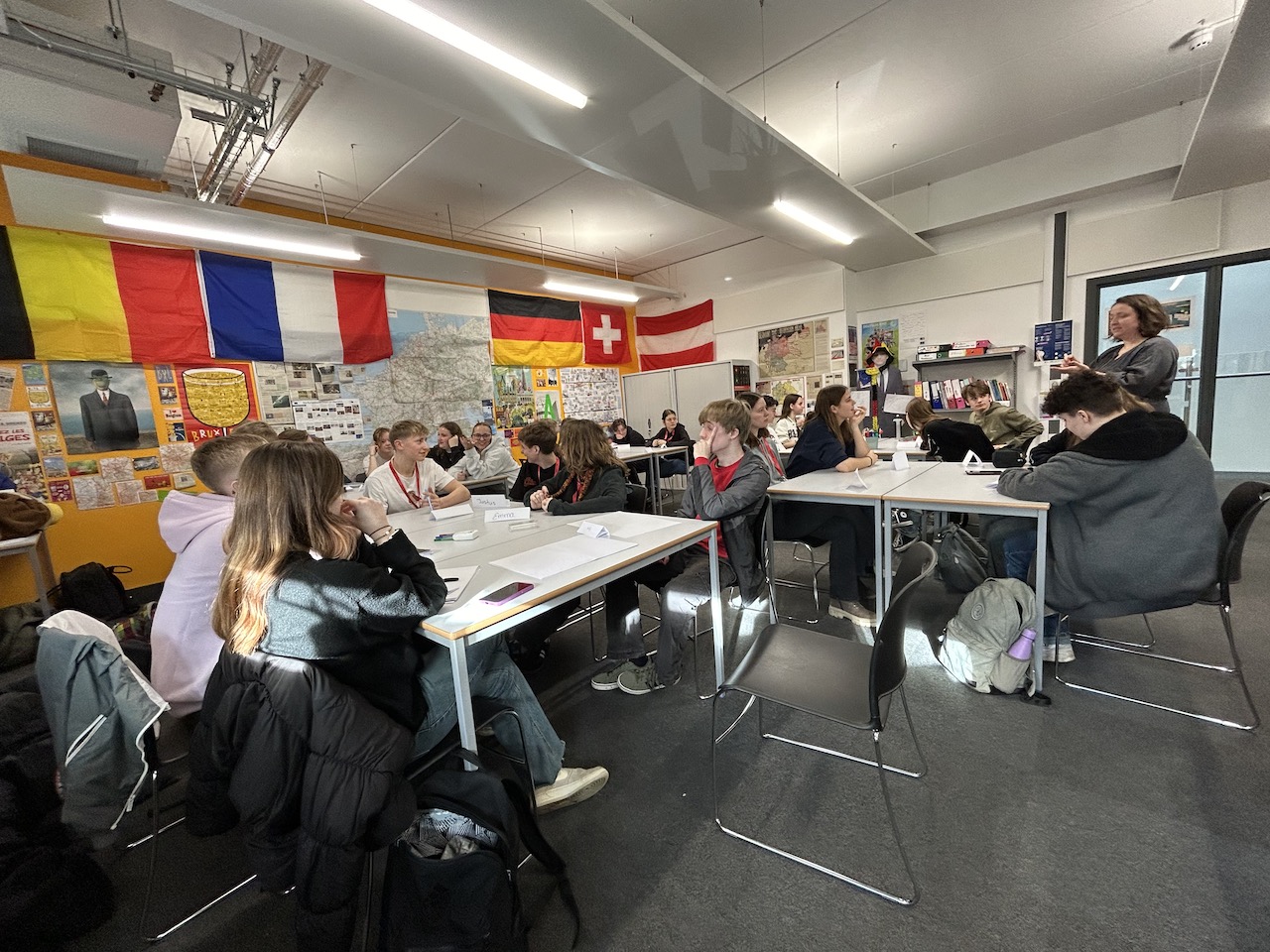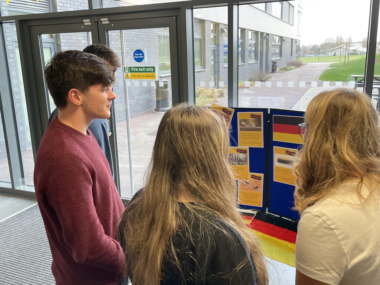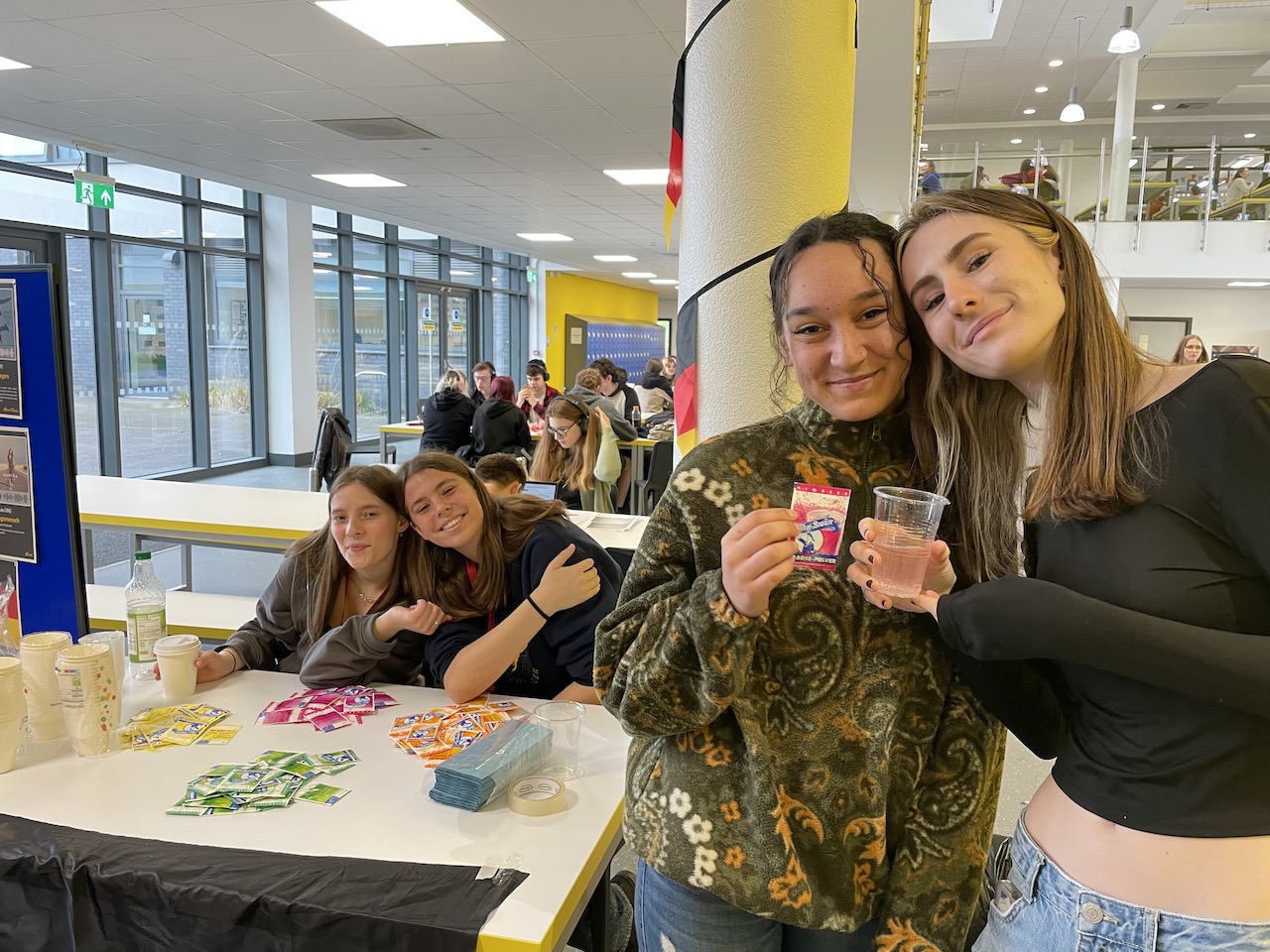 Dienstag und Mittwoch stand dann die Projektarbeit im Vordergrund. Am Dienstag organisierten die Martinumsschüler*innen einen wahren „Circus of Culture“ im Ausstellungsbereich der Schule, der von sehr vielen Abbeygate-Schüler*innen in ihren Pausen und Freistunden frequentiert wurde. Wenig überraschend – luden doch viele Aktionen zum Mitmachen ein. So hatten Gesa Marwede und ihr Austauschpartner Isaac Cowling den Vorabend damit verbracht, zwei Kilogramm Münsterländer Schwarzbrot zu kleinen Snacks zu verarbeiten, die dann probiert werden konnten. Am Nachbartisch konnte Brause probiert werden – eine der wenigen Süßigkeiten, die auch in Zeiten der Globalisierung noch nicht den Sprung nach England geschafft haben. Und natürlich durften auch andere typisch deutsche Süßigkeiten nicht fehlen. Darüber hinaus gab es noch weitere Mitmachaktionen, so hatten die deutschen Jugendlichen zum Beispiel eine Ausstellung zu deutschen Zungenbrechern und deutscher Musik vorbereitet, die von den englischen Schüler*innen nachgesprochen bzw. angehört werden konnten. Manch ein deutsches Lied regte dann sogar zu einem spontanen Tanz an, auch wenn sich manche englischen Schüler*innen von den deutschen Karnevalsliedern und Schlagern doch ein wenig irritiert zeigten.