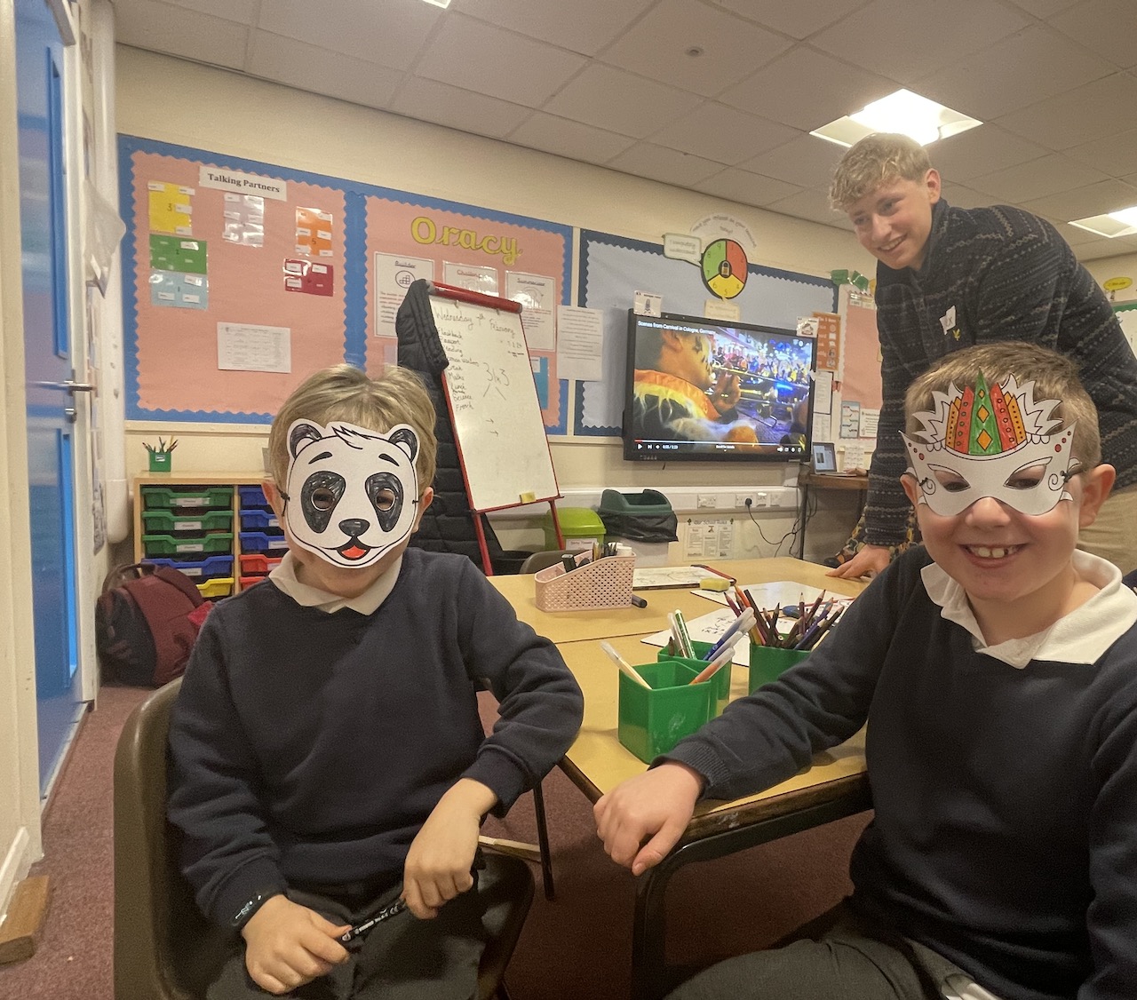 Der wohl aufregendste Tag stand dann am Mittwoch bevor: Nun sollten auch die Kinder der Stanton Primary School die Möglichkeit bekommen, einen Einblick in die deutsche Sprache und Kultur zu erhalten. „Ich bin sehr gespannt, ob ich die Kinder überhaupt verstehe, wenn sie Englisch sprechen“ – das war die größte Sorge, die bei vielen Jugendlichen bestand. Als sie dann aber in Kleingruppen erst einmal vor den 4 bis 11-jährigen Kindern standen, zeigte sich, dass sie sich unnötig Gedanken gemacht hatten – und so manch eine*r von ihnen entdeckte vielleicht sogar seine Liebe für das Grundschullehramt. So brachten sie den älteren Kindern die ersten Sätze auf Deutsch bei, so dass sie am Ende kleine Dialoge führen konnten. Darüber hinaus erzählten sie von der deutschen Tradition des Karnevals – sehr passend am Mittwoch vor Weiberfastnacht. Aus diesem Grund wurden dann auch im weiteren Verlauf Masken gebastelt, die von den deutschen Jugendlichen schon vorbereitet worden waren, so dass sie nur noch ausgemalt werden konnten. Zudem erfuhren die Kinder dann den jeweils deutschen Begriff für das von ihnen dargestellte Wesen und konnten feststellen, dass sich manche Begriffe – wie Giraffe, Elefant, Tiger, Pirat etc. – gar nicht so sehr von ihren englischen Begriffen unterscheiden. Schwieriger wurde es da schon für die Kinder, die den Vogel, den Hund oder gar den Schmetterling gewählt hatten. „Es ist toll, wie sehr sich die Jugendlichen auf ihre Lehrerrolle eingelassen haben. Ich glaube, dass sie von diesem Besuch in der Grundschule und der Vermittlung ihrer eigenen Kultur noch viel mehr mitnehmen, als wenn wir zum Beispiel eine weitere englische Stadt besucht hätten,“ zeigte sich Denise Instinsky begeistert von dem Engagement der Schüler*innen. Den Abschluss des Tages bildete dann ein Maskenumzug über den Schulhof.