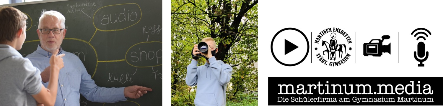 Um Schüler*innen die Möglichkeit zu geben den Wunsch „irgendwas mit Medien“ frühzeitig auszuprobieren, für sich konkret(er) zu machen und praktische Erfahrungen und erste Arbeitsproben zu sammeln, haben Schüler*innen aller Jahrgänge die Möglichkeit in der Schülerfirma martinum.media mitzuarbeiten.