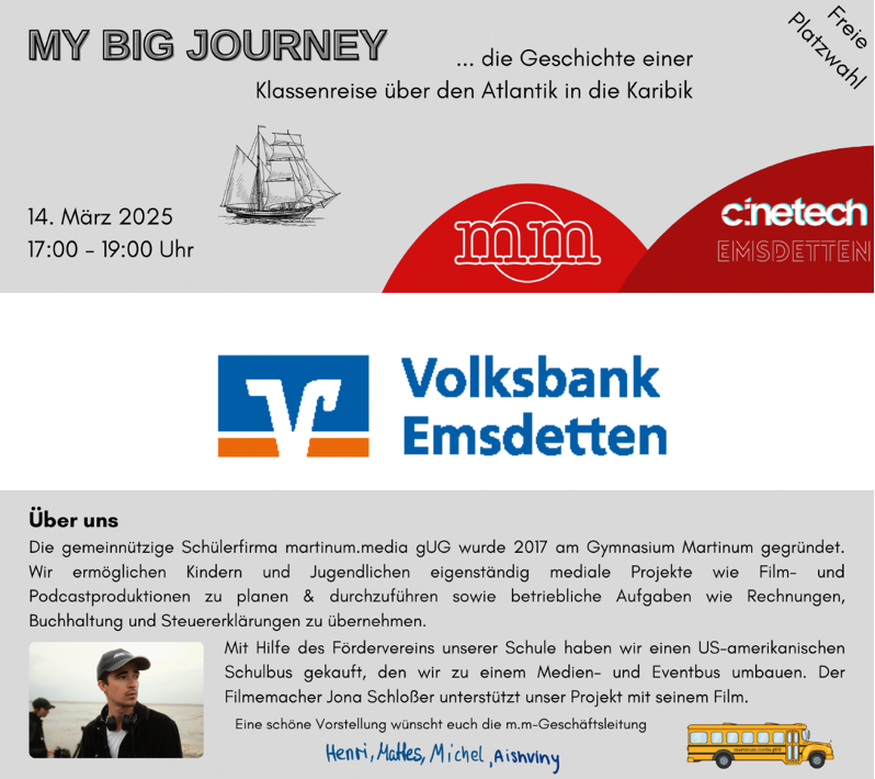 Am Freitag, 14. März um 17:00 Uhr findet eine besondere Filmvorführung statt: Der Film "My Big Journey" ist im Emsdettener Cinetech-Kino zu sehen. Dieser inspirierende Film begleitet 34 Schülerinnen und Schüler, die ein halbes Jahr lang auf einem 50 Meter langen Traditionssegler den Atlantik überqueren und in die Karibik reisen. Der Produzent und heutige Filmemacher Jona Schloßer dokumentierte dieses Abenteuer mit seiner Kamera.