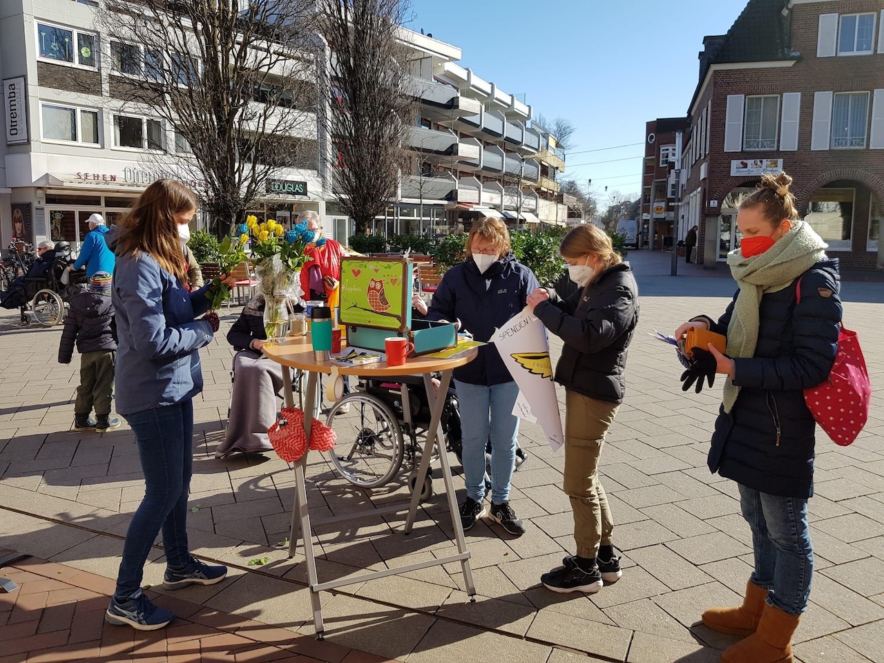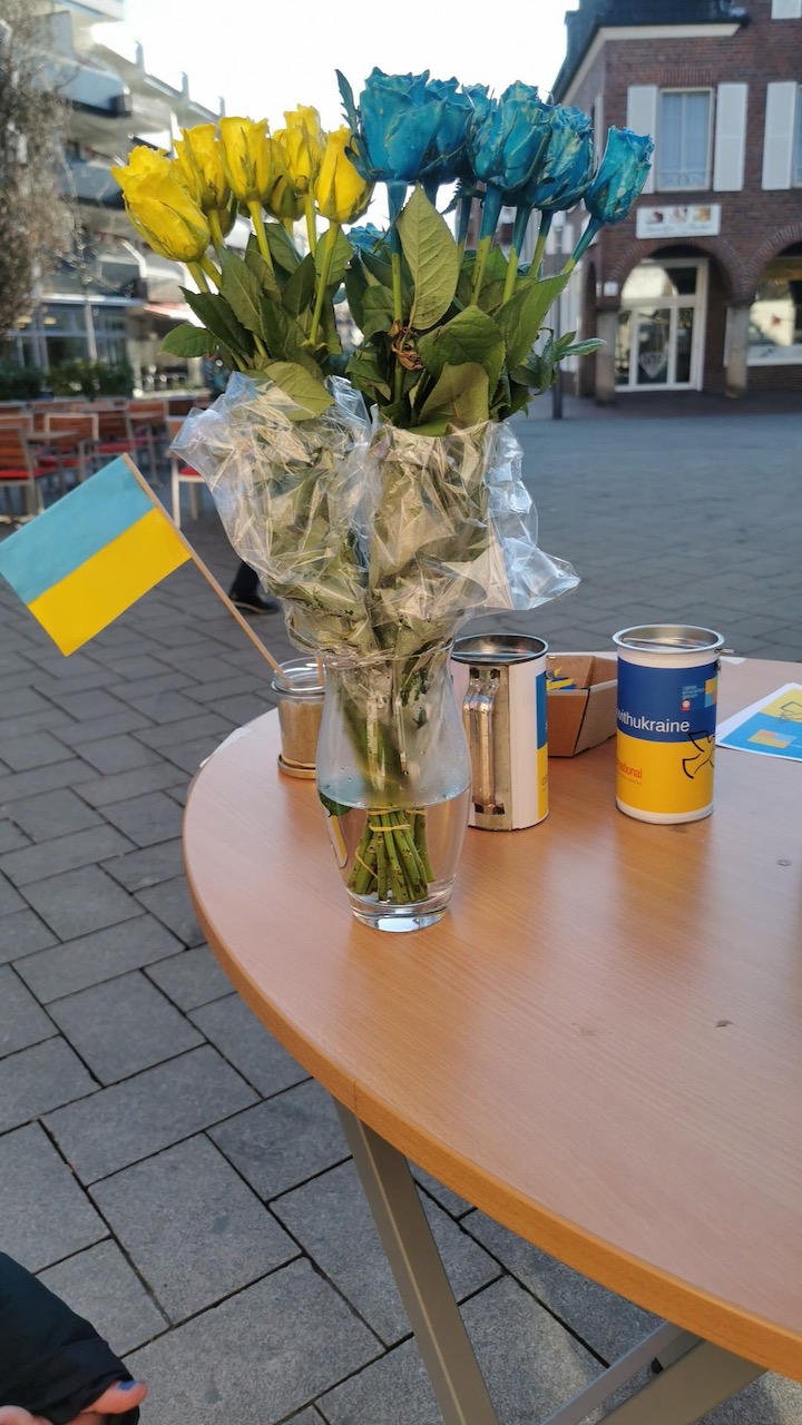 In den ersten Tagen nach Ausbruch des Kriegs in der Ukraine beschlossen die Schüler*innenvertretung des Martinums, dass sie aktiv Geld für die Menschen in der Ukraine sammeln wollten. Dazu gestalteten alle Schüler*innen des Martinums Friedenstauben mit unterschiedlichem Muster, die dann Anfang März an zwei Tagen auf dem Emsdettener Wochenmarkt verkauft wurden. So konnte am Ende ein Spendenbeitrag im vierstelligen Bereich an die Caritas übergeben werden.