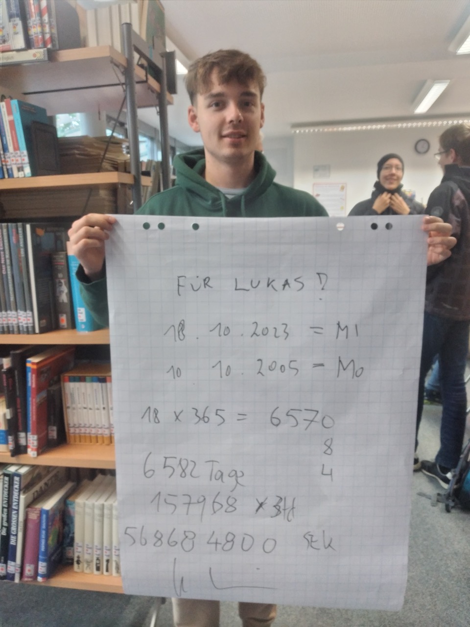 Ein nachträgliches Geburtstagsgeschenk nahm Oberstufenschüler Lukas mit nach Hause: Er hatte zuletzt Geburtstag und durfte sich von Mittring die Anzahl der bisher erlebten Sekunden vorrechnen und aufschreiben lassen: 568.684.800.