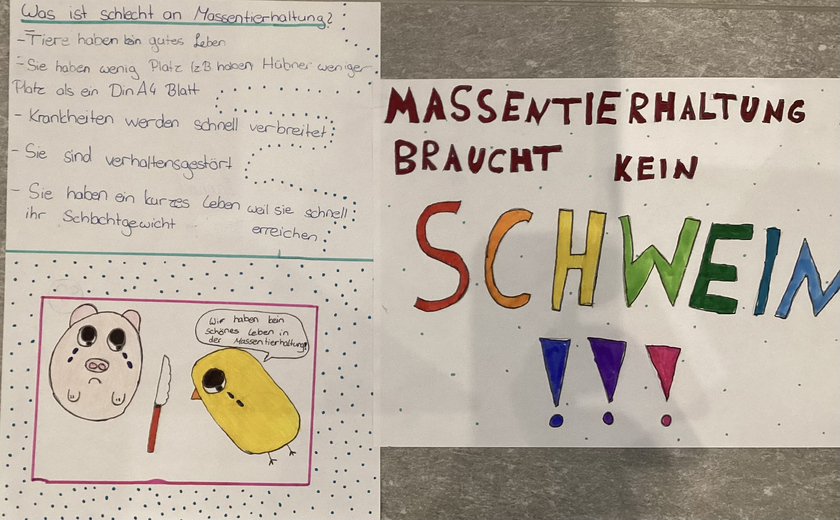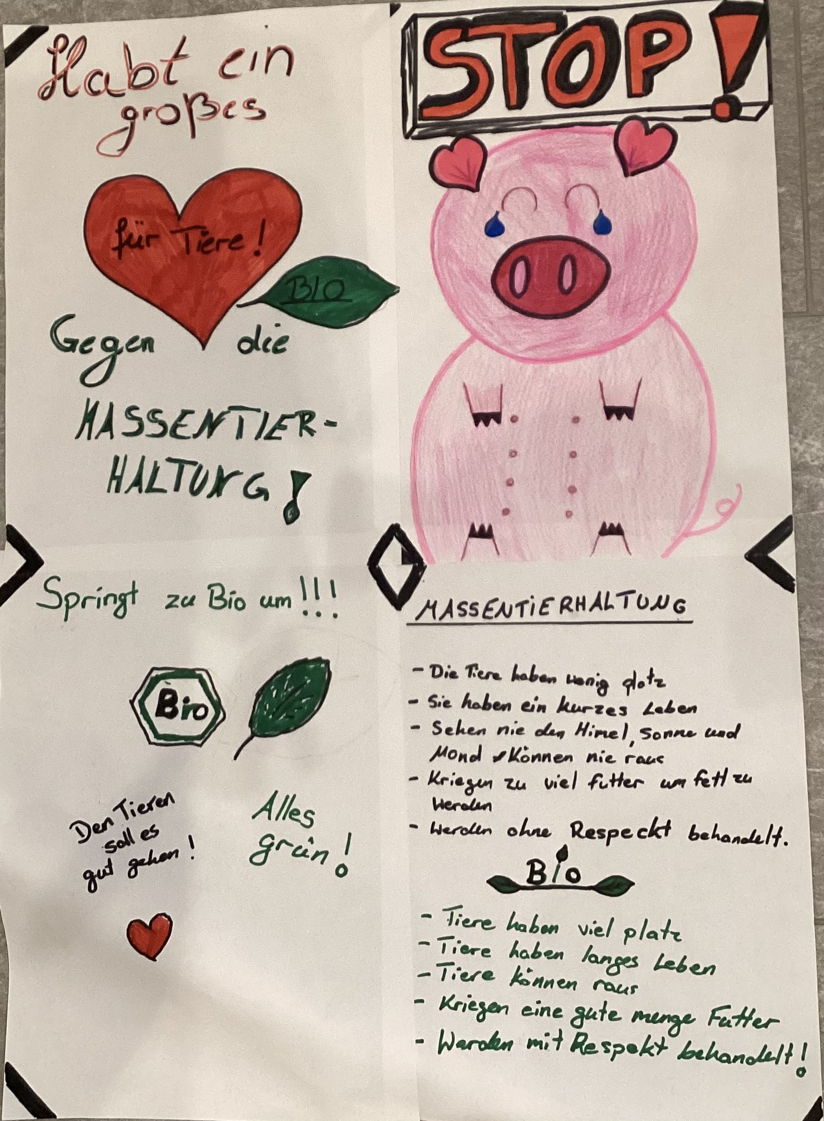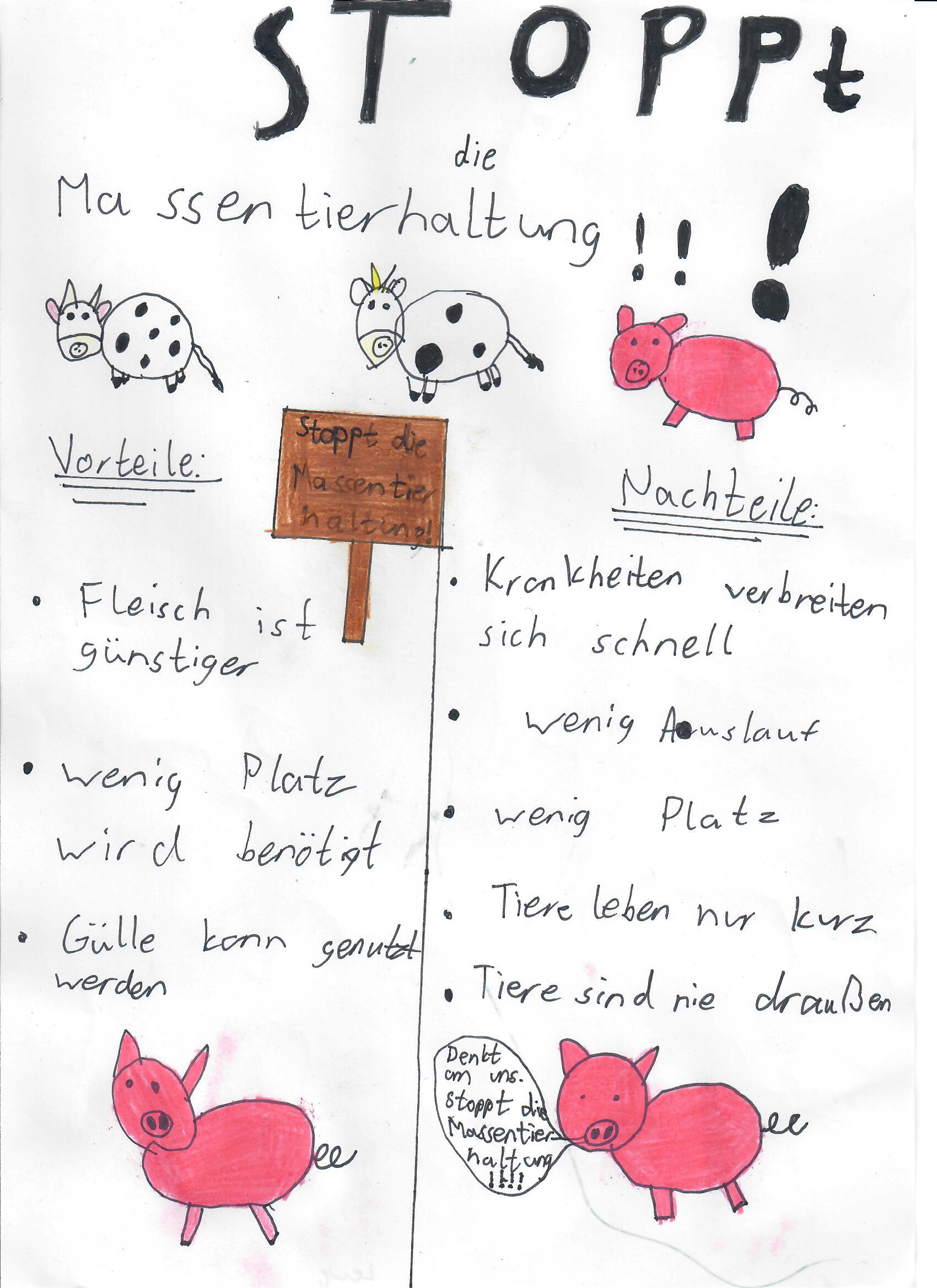 Besonders der Unterschied zwischen der konventionellen und der ökologischen Tierhaltung hat die Schülerinnen und Schüler sehr beschäftigt und sie haben viele Unterschiede zwischen diesen Haltungsformen festgestellt. Dies nahmen sie als Anlass, um auf das Tierwohl, die Nachteile in der konventionellen Tierhaltung und die Vorteile der ökologischen Tierhaltung aufmerksam zu machen.