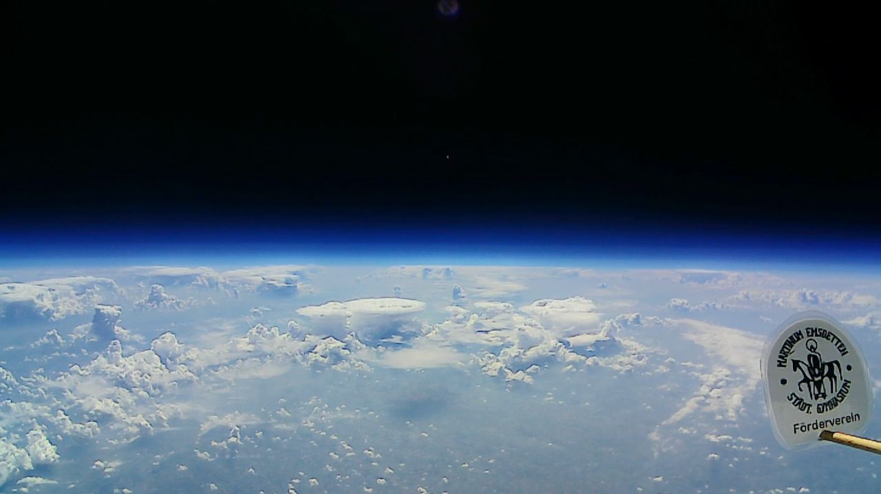 Danach begann das Zittern. Der GPS Sender ist irgendwann zu hoch und kann kein Signal mehr schicken. Wird er die Verbindung wiederfinden und den Landeplatz preisgeben? Er wird! Trotz Hitzefrei machte sich der Kurs in den privaten Autos der Eltern auf die abenteuerliche Reise die Sonde wiederzufinden. In einem Maisfeld in Emsbüren wurde der Kurs fündig, der Jubel war groß. Wieder zurück in Emsdetten kannte der Jubel dann keine Grenzen mehr, als die ersten Bilder aus 30.000m Höhe zu sehen waren. Oben das Schwarz des Weltraums und unten die blaue Erde. Dafür hat sich der Aufwand definitiv gelohnt. Ein großer Dank geht auch an den Förderverein des Martinums, der dieses tolle Experiment erst möglich gemacht hat!