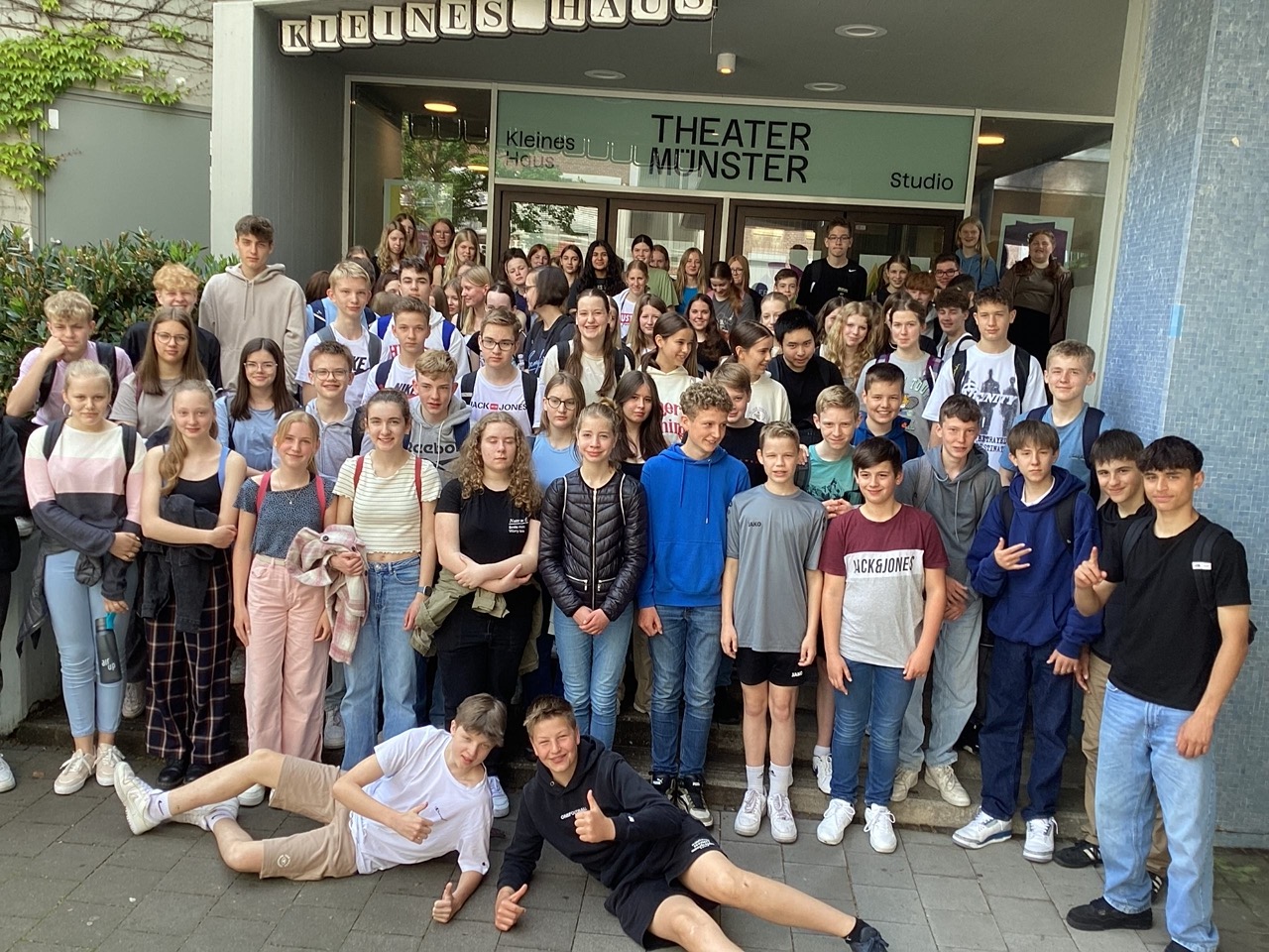 Am Montag, den 22.5.2023, ging es mit der gesamten Stufe 8 bei sommerlichem Wetter mit dem Zug und zu Fuß in das Theater Münster. Dort stand das Stück "33 Bogen und ein Teehaus" auf dem Programm.