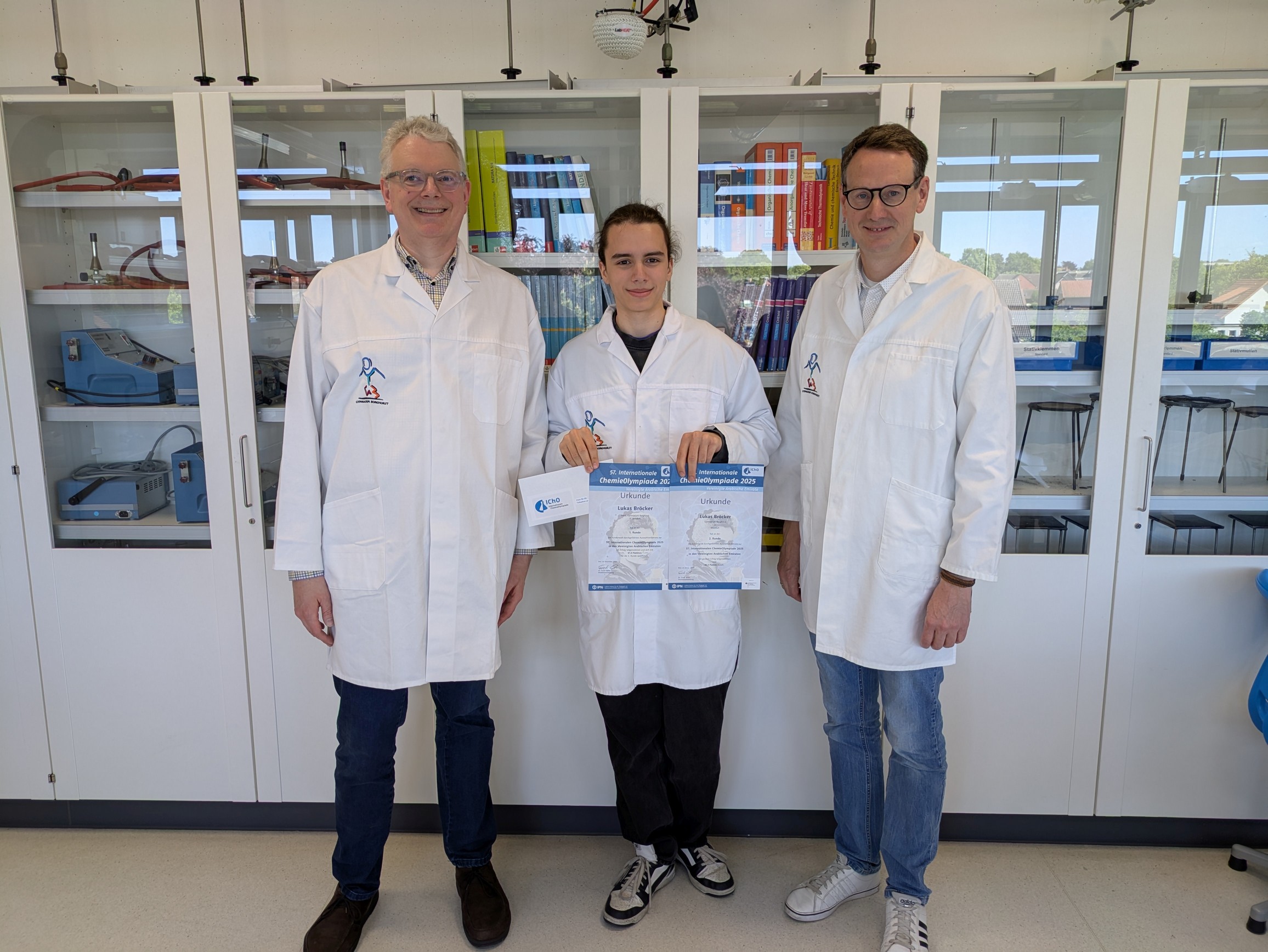 Da Lukas als Mitglied des Koop-Chemie-LK sein Abitur am Gymnasium Martinum erworben hat, dürfen sich gleich zwei Schulen über diesen besonderen Erfolg freuen. Zuerst gratulierte im Mai - kurz vor den Abiturprüfungen - GymBo-Schulleiter Dr. André Wenning bei der Übergabe der IChO-Urkunden durch Betreuungslehrer Andreas Bokelmann.