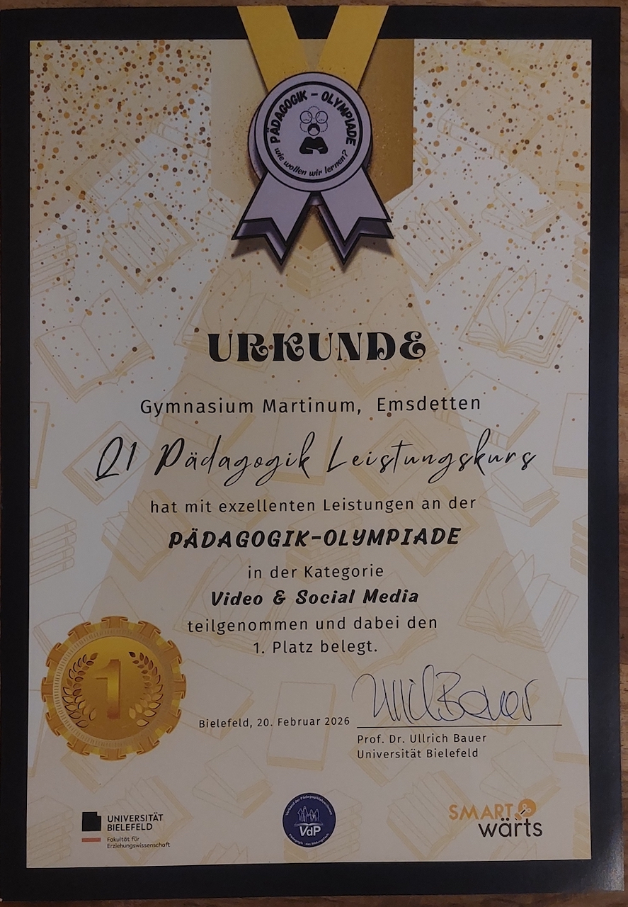 Am 20.02. fand die Preisverleihung der 3. Pädagogikolympiade der Universität Bielfeld mit dem Thema „Wie wollen wir lernen?“ statt. Unser Olympiabeitrag bestand in einer Art Videodokumentation über unseren selbstgestalteten Lernprozess zum von uns ausgewählten Lehrplaninhalt „symbolischer Interaktionismus nach G. H. Mead“.
